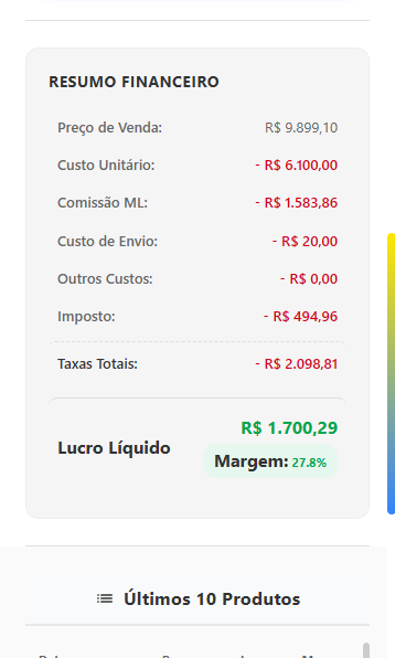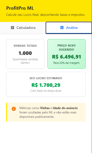 Transforme sua navegação no Mercado Livre com uma visão de raio-x. Acesse taxas, impostos e margem líquida instantaneamente, sem sair da página do produto.